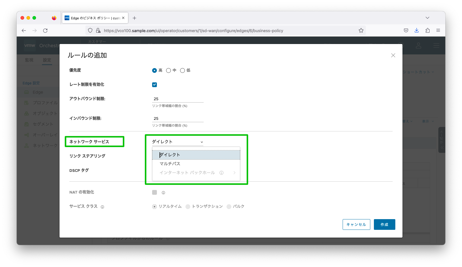 「ネットワークサービス」とは、どのように転送するかです。「ダイレクト」は別名ローカルブレークアウトとも呼ばれる挙動でインターネットへ直接通信する転送手法です。「マルチパス」はSD-WAN GatewayへのVCMPトンネルを経由して転送される手法です。そのほか、以下スクリーンショットではグレーアウトされていますが、zScalerやVMware SASEなどのSaaSサービスへ転送する設定も可能です。