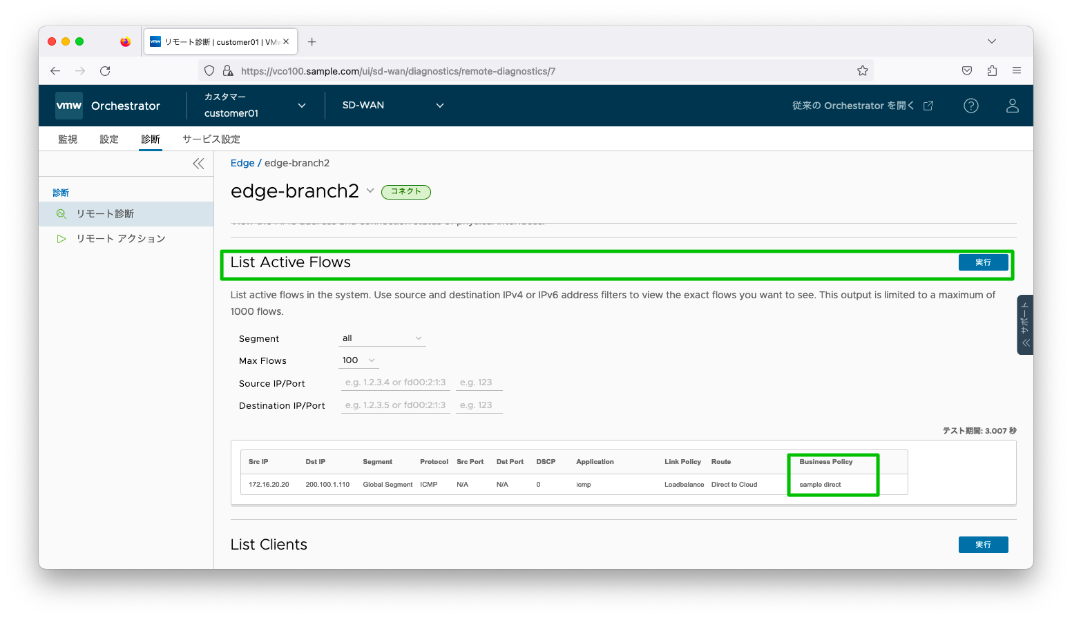 通信経路が「マルチパス」であるか「ダイレクト」であるかは、SD-WAN Orchestratorのリモート診断機能でも確認可能です。branch2拠点の「リモート診断」画面で、「List Active Flows」の「実行」をクリックすると、どのようなビジネスポリシー名にマッチしたかをデバッグ出力する事ができます。